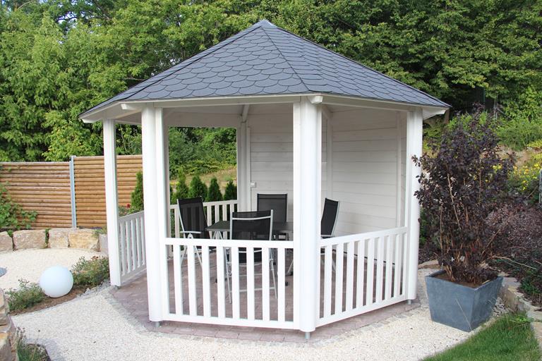 anbei drei Bilder des wunderschönen Pavillons, welcher trotz Sichtschutzelementen ein einzigartiger Blickfang in unserem Garten ist und von vielen bewundert wird. Die Inneneinrichtung (passende Biergarnitur mit rundem Tisch und Stühlen) erhalten wir leider erst in einigen Monaten (da in weiß bestellt). Ein ganz gelungener Aufenthaltsort.